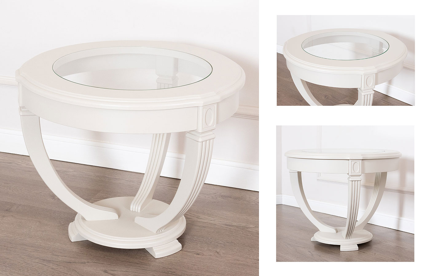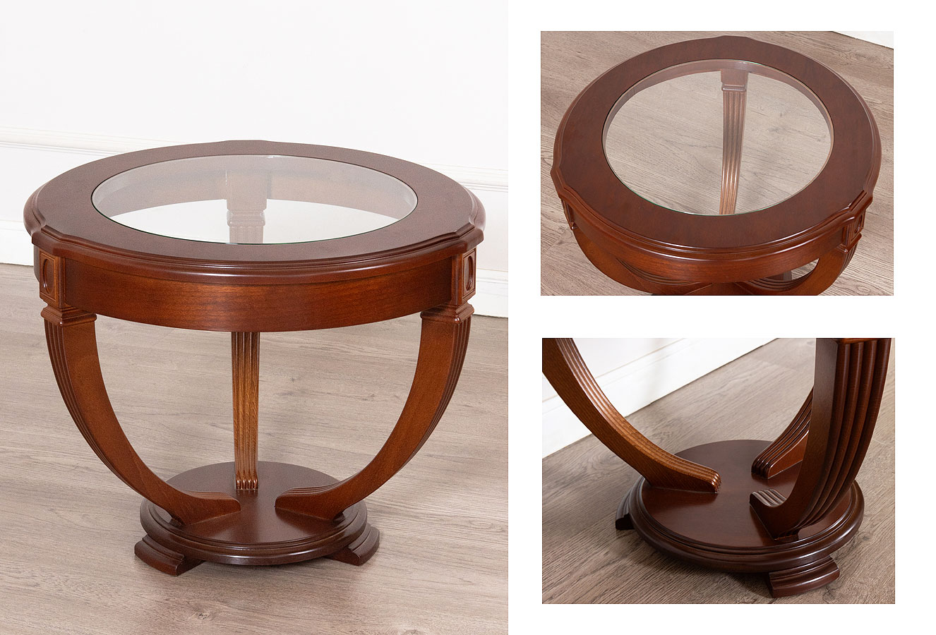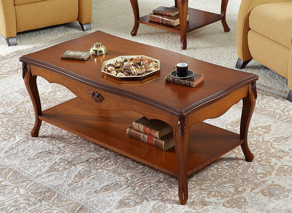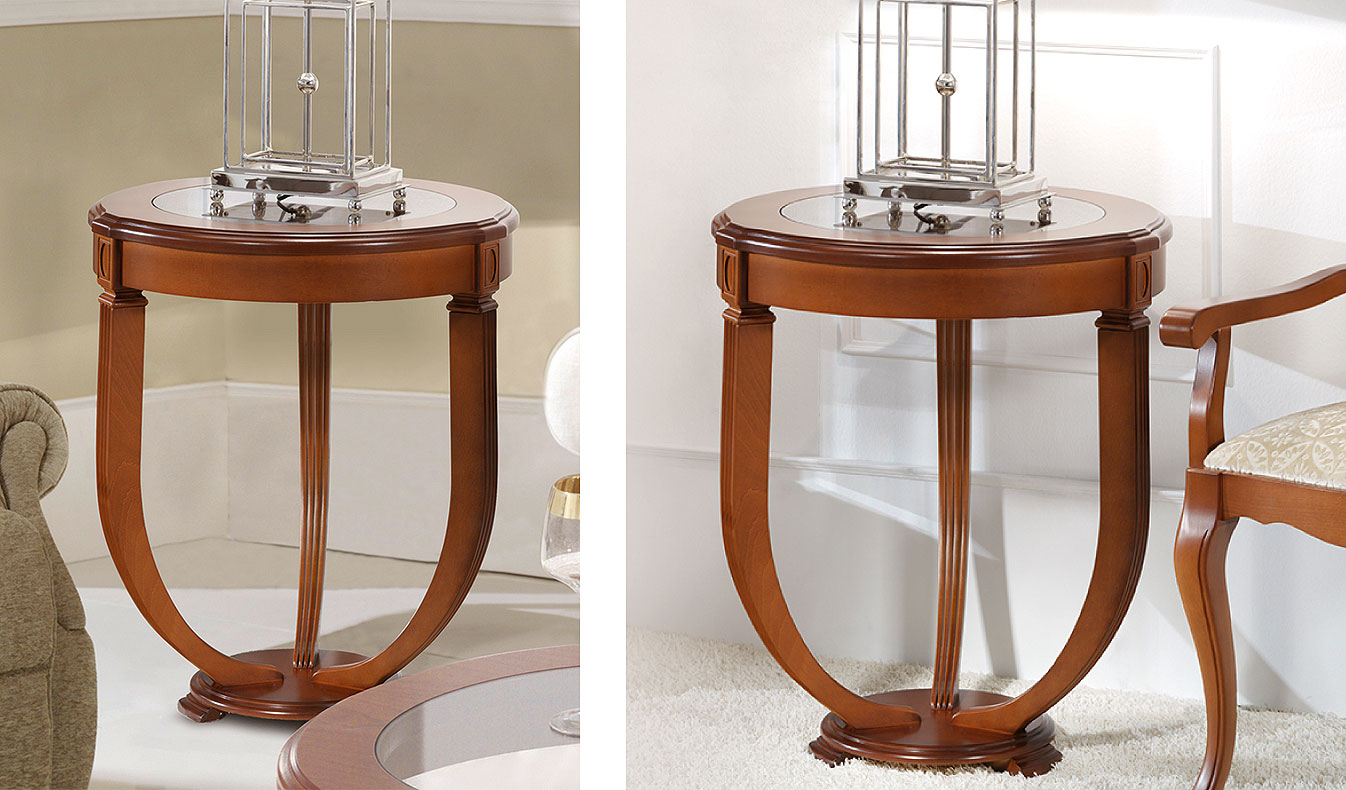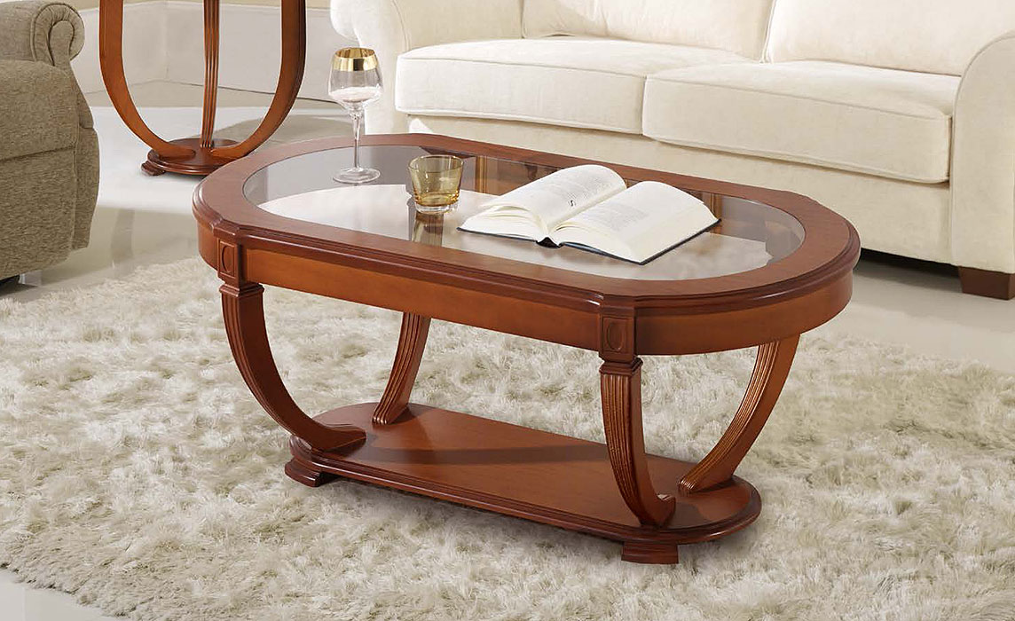 Журнальные столики круглые, овальные, прямоугольные со стеклянной или деревянной столешницей фабрика Disemobel (Дисемобел) Испания коллекция Classic натуральный шпон, массив дерева цвет вишня (cerezo-5), орех (nogal-5), белый (vainilla) на резных деревянных ножках из массива бука